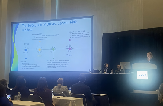 A woman’s risk of breast cancer is typically calculated using clinical models such as the Breast Cancer Surveillance Consortium (BCSC) risk model, which uses self-reported and other information on the patient—including age, family history of the disease, whether she has given birth, and whether she has dense breasts—to calculate a risk score. Learn more